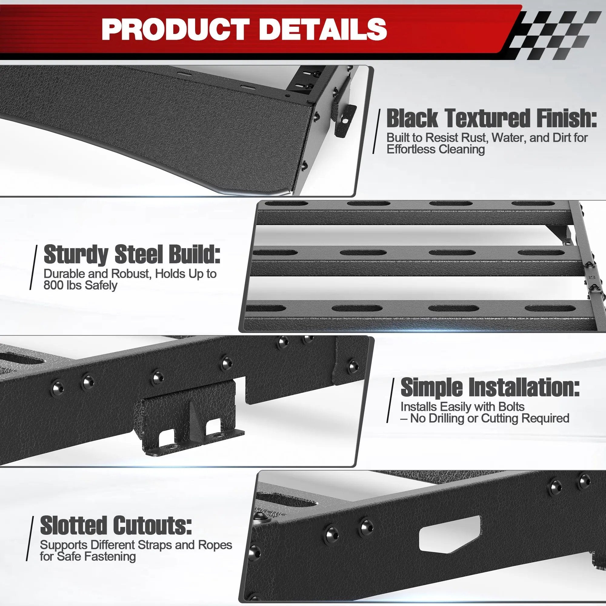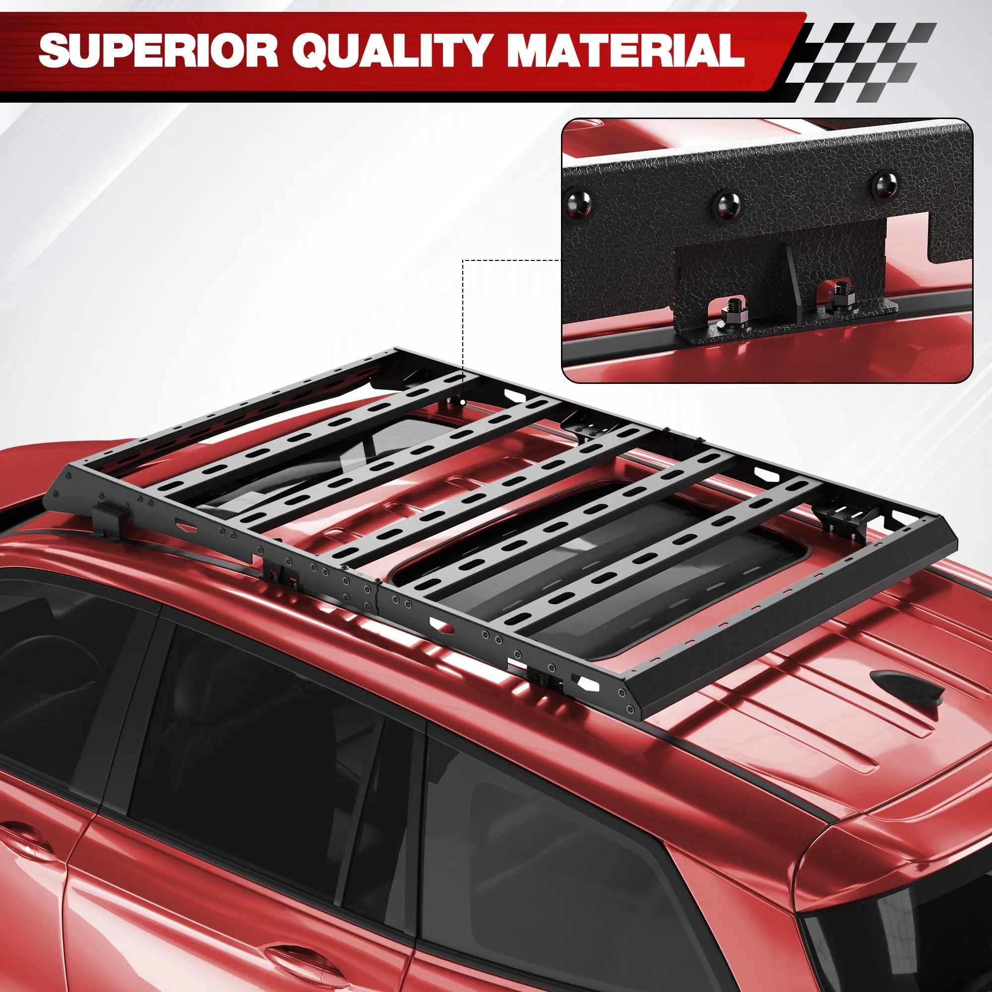 • Durable:Made of heavy-duty steel, the SUV roof rack cargo carrier provides high-quality e-coating process and textured black powder coat finish, making it exceptionally durable, so you don't have to worry about wear and tear, even on rough terrain. This heavy-duty roof rack is the perfect solution for traveling.
